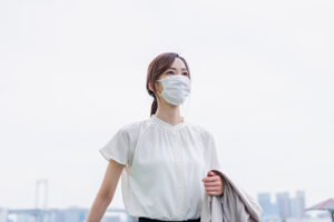 Businesswoman walking in the city wearing a mask