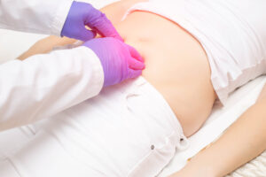The doctor probes the lower abdomen in a girl who has pain and inflammation of the bladder. The concept of diseases in girls cystitis, kidney stones, dysmenorrhea