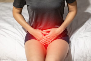 woman have bladder or uti pain sitting on bed in bedroom after wake up feeling so illness,Healthcare concept